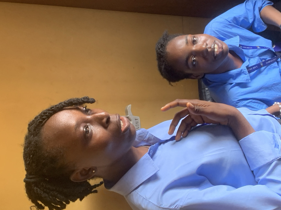 The scene depicts an indoor environment in Ijanikin, Nigeria, featuring two dark-skinned female subjects against a plain mustard-yellow wall