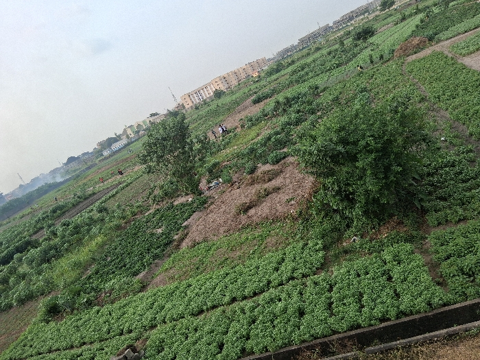 A vast, cultivated field slopes upward towards a distant cityscape. Rows of leafy green crops dominate the foreground, interspersed with patches of bare earth and small trees. In the midground, figures appear to be working the land. The skyline reveals buildings under a hazy, overcast sky, adding a sense of urban proximity to this agricultural scene.