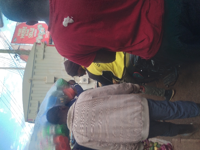 Several people are standing outside. A man in a red shirt with a white patch is visible from behind. Another individual wears a yellow vest. A person carries a large bag of plastic containers. A gray and white patterned jacket is also visible. In the background, a white shipping container stands beside a building with a red and white sign. Power lines stretch across the sky.