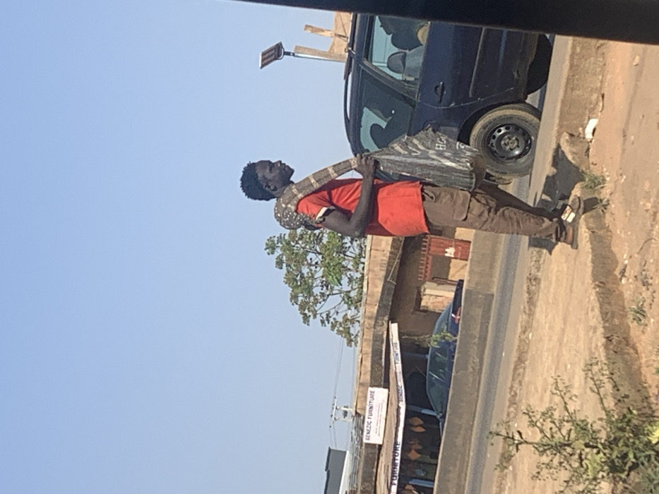 The image depicts an outdoor street scene in Jos, Nigeria, under a clear, bright blue sky
