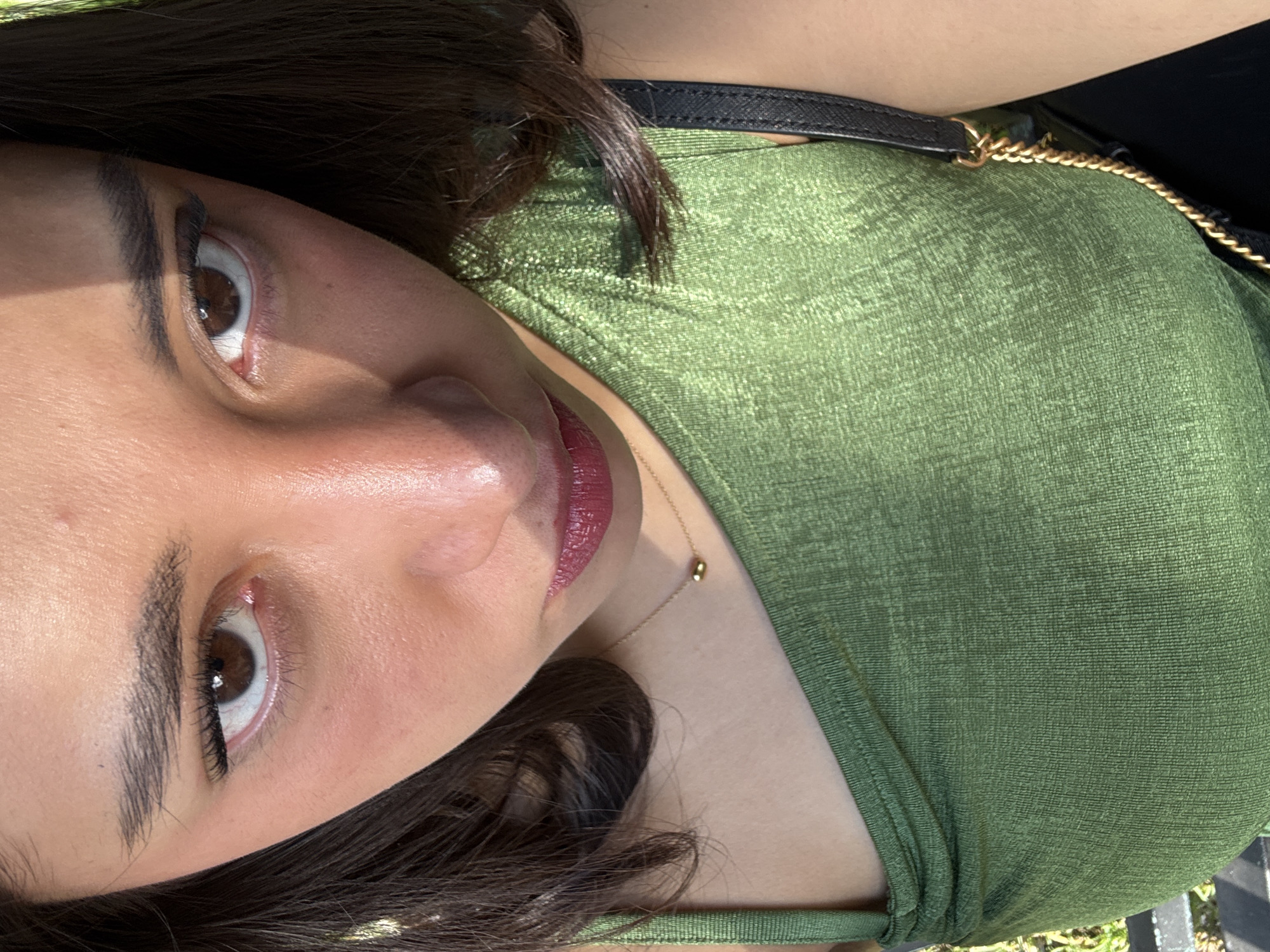 A close-up, tilted portrait of a woman with brown eyes, dark hair, and olive-toned skin. She wears a green, shimmery top and a delicate gold necklace. Part of a black purse strap with gold chain detail is visible over her shoulder. The location is not identifiable as Atlixco, Mexico, or any other specific place. The background is blurry, with hints of green and black, suggesting an outdoor setting, possibly a park or garden.