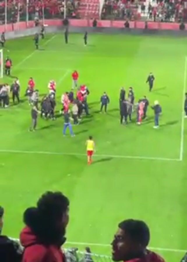 A video shows a soccer field with a crowd of red-clad people celebrating on the field