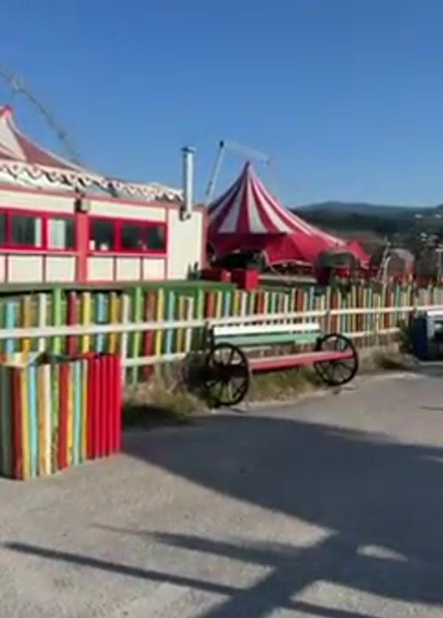 The video pans across an outdoor space, seemingly a park or recreational area with a whimsical, circus-like theme