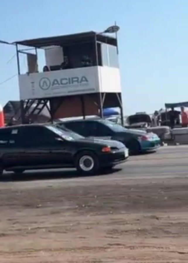 two dark-colored Honda Civics accelerating from a standstill down a drag racing track