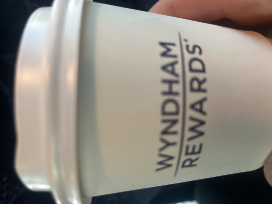 A white disposable cup displays "Wyndham Rewards" vertically in a dark blue, sans-serif font