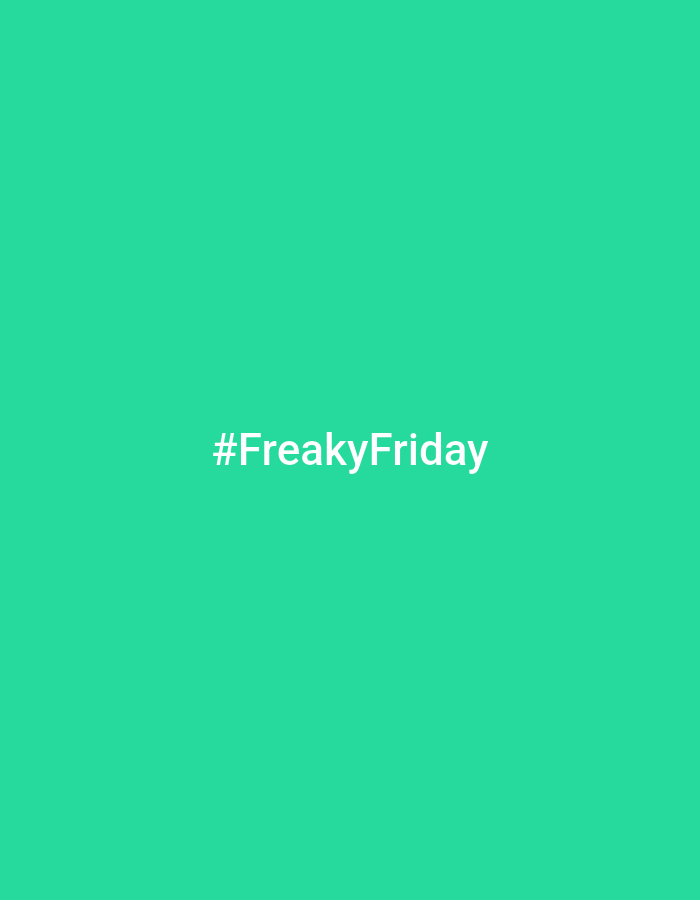 The image displays a uniform teal-green background. Centered horizontally and vertically on this background is the white text string "#FreakyFriday". There are no people, distinct subjects, or objects visible apart from the textual element. No actions or interactions are depicted within the scene. The environment is an abstract graphic field; no specific physical location, such as an area within the city of Blagoevgrad, Bulgaria, is visually represented in this image.