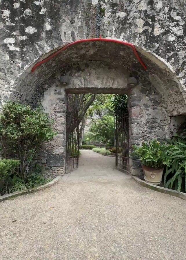 The video presents a straight-on view progressing through a stone archway into a garden