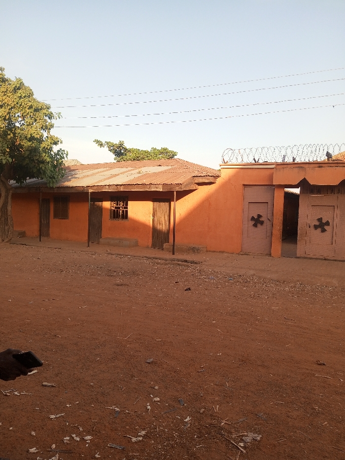 The image depicts a static exterior scene in Rigasa, Nigeria, under clear daytime conditions. The foreground consists of reddish-brown dirt, appearing as an unpaved surface, with scattered debris including small stones and light-colored fragments. On the left, a large tree with green foliage partially obscures a single-story structure. This building features orange-painted walls and a weathered, reddish-brown corrugated metal roof. Its facade includes two dark wooden doors and a window equipped with a dark security grille, all elevated by a low concrete foundation. A simple awning, supported by thin dark poles, extends from the building's front. Adjacent to the right of this structure is an orange-painted perimeter wall. This wall incorporates a double-leaf metal gate; the left leaf is closed, while the right leaf is slightly open, revealing a dark recess behind it. Both gate leaves are light-colored and adorned with a central dark, four-spoked wheel or starburst design. Coiled razor wire is affixed along the top edge of this wall. In the upper portion of the frame, against a light blue sky, several dark, thin overhead wires are visible. No individuals are present in the scene.