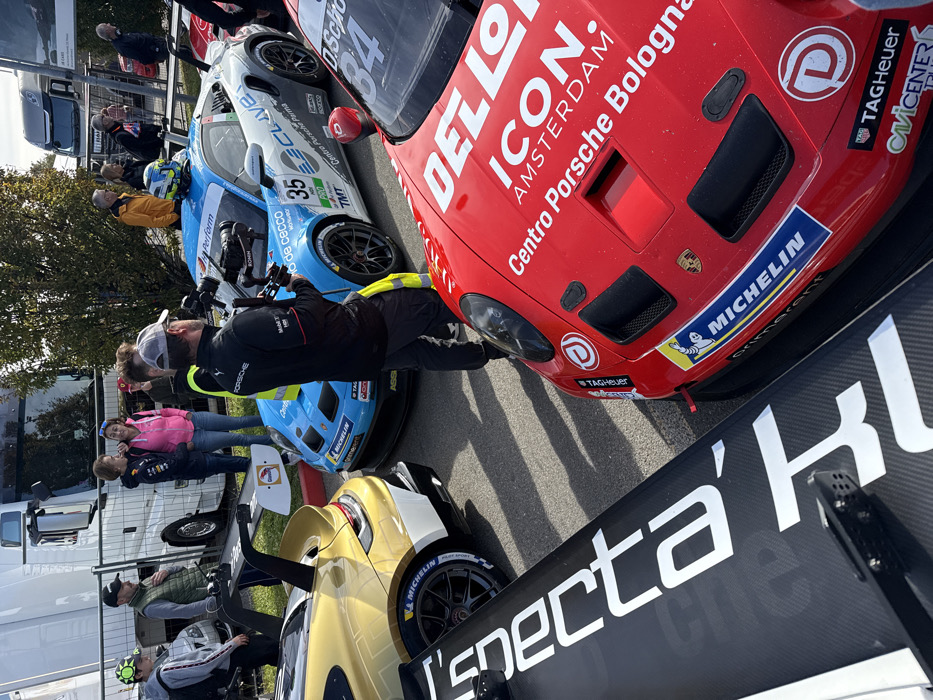This image depicts an outdoor paddock or staging area at the Autodromo Nazionale Monza in Monza, Italy. The scene features three high-performance Porsche race cars and multiple individuals under daylight conditions. In the foreground, the front section of a red Porsche race car is visible, displaying "DEL LOI ICON AMSTERDAM," "Centro Porsche Bologna," "MICHELIN," and "TAG Heuer" branding, along with the partially visible number "84." To its immediate left, the rear section of a gold-colored Porsche race car is shown, featuring a prominent rear wing with a "Gasoline" logo and "MICHELIN" branding on its tires. Centrally positioned is a blue and white Porsche 911 GT3 Cup car, designated with the number "35," adorned with "de cecco," "Centro Porsche Parma," and "MICHELIN" decals. A blue and yellow racing helmet rests on the roof of this car, and its front hood is slightly ajar. A male individual, wearing a grey baseball cap, dark jacket, and a partially obscured yellow high-visibility vest, stands in front of the blue and white car, actively operating a camera mounted on a gimbal stabilizer. In the background, several individuals are observing the scene: a group of approximately six people, including a person wearing a green helmet or hat and a woman in a bright pink jacket, are positioned near the gold-colored car and a large white semi-trailer truck. Further back, additional individuals are visible near a grey semi-trailer truck and a metal fence. The ground is paved asphalt, and large semi-trailer trucks, likely racing team transporters, are parked in the background. Distinct shadows are cast across the pavement, indicating sunny or brightly overcast conditions.