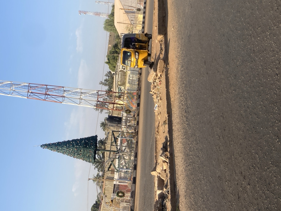 The scene depicts a street in the city of Yelwa, Nigeria, under a clear, bright blue sky with direct sunlight. In the foreground, a two-lane asphalt road occupies the lower half of the frame, showing signs of wear. A broken concrete median or curb runs along the left edge of the road, featuring scattered rubble and dirt. In the midground, a yellow, three-wheeled auto-rickshaw (keke napep) is positioned on the road, facing slightly towards the right. A person in a purple garment is partially visible within the vehicle. To the left of the road, beyond the median, stands a prominent, tall, green conical structure resembling a Christmas tree, adorned with small red and white spherical ornaments. This tree is mounted on a dark metal base, behind which a black water tank is visible. The area around the base of the tree and along a fence line features additional green wreath decorations. Further into the background, a large, white and red lattice communication tower rises prominently. To its left, behind the Christmas tree, a building with a sign reading "PENCRACK FURNITURE LTD" is visible. Palm trees and other vegetation are interspersed throughout the background. Another, smaller lattice communication tower can be seen in the far distance on the right side of the frame. No discernible human actions or interactions are clearly visible beyond the presence of the individual in the auto-rickshaw.