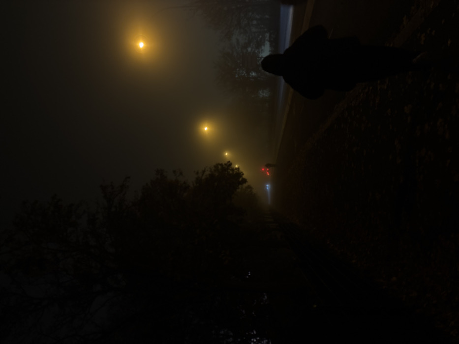 The image depicts a nighttime street scene in Strasbourg, France, characterized by dense fog. The scene is illuminated by artificial streetlights, casting a yellowish-orange glow that penetrates the fog and creates visible halos. In the foreground, on the right side of the frame, a person is visible from behind, appearing as a dark silhouette, wearing a hooded garment, and walking forward on a paved surface. To the left, a dark, tree-lined area runs parallel to the path. In the midground, further along the path or road, a second individual is discernible as a dark silhouette. Beyond this person, vehicle lights are visible: two prominent red taillights and, further in the distance, blue/white headlights, all diffused by the heavy fog. The paved road extends into the distance on the right, bordered by more indistinct trees and vegetation softened by the atmospheric conditions. Overall visibility is significantly reduced.