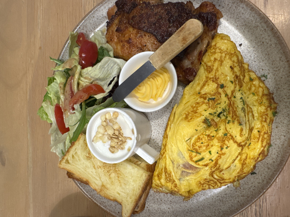 A large, round, speckled grey ceramic plate, positioned on a light brown wooden surface, displays a full breakfast or brunch meal in Longta, China. The plate contains an arrangement of food items: a portion of green lettuce salad with red bell pepper slices and a light dressing is situated at the top-right. Below the salad, to the right, is a piece of dark brown, seared or grilled meat, possibly chicken. A yellow, folded omelet, garnished with green herbs, occupies the bottom-left section of the plate. To the top-left, two pieces of golden-brown toasted bread are presented. Centrally located are two small white bowls and a white mug. The mug, equipped with a handle, holds a white substance topped with light brown granola or cereal. Adjacent to the mug, a small bowl contains swirled yellow butter, with a butter knife featuring a dark blade and light wooden handle resting horizontally across its rim. No individuals or active interactions are present in the static scene.