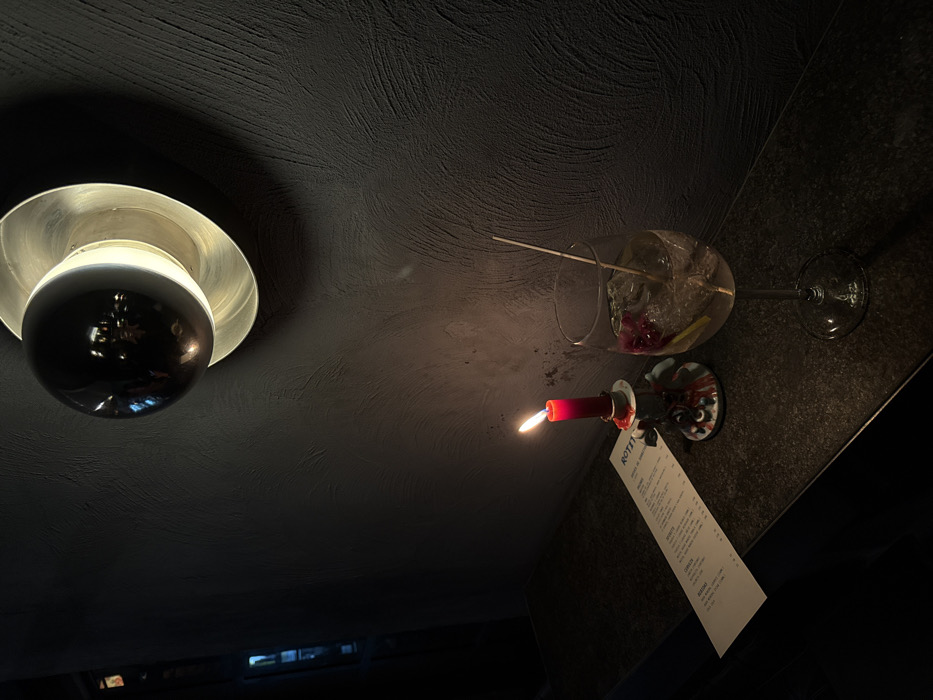 Dimly lit scene showcasing a light fixture on a dark, textured ceiling, alongside a wine glass tipped over with a stirrer, a lit red candle in an ornate holder, and a menu card hanging from the candle holder