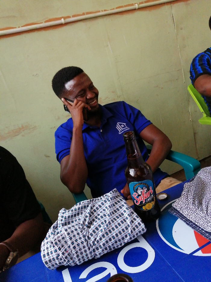 The image captures an indoor scene in Machinjioni, Tanzania, featuring three individuals gathered around a blue table bearing a prominent Pepsi logo. The central figure is a dark-skinned male with short dark hair and a beard, wearing a royal blue polo shirt with a white "PERFECT PROPERTY" logo on the left chest. He is smiling broadly, holding a black smartphone to his right ear, indicating an active phone conversation. To his right, on the table, stands an open brown glass bottle of Safari Lager beer, with its white cap lying nearby. Two distinct patterned fabric items are also present on the table surface. Partially visible in the lower-left foreground is the left arm and hand of another individual, wearing a black shirt and a silver-colored watch. In the upper-right background, a third person is partially visible, wearing a blue and black striped shirt and seated on a bright green plastic chair. The background consists of a plain, light green/beige painted wall with a white pipe running horizontally across its upper section.