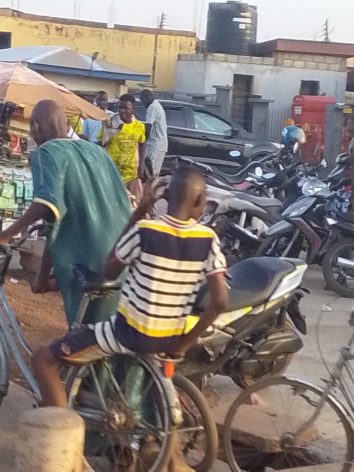 An outdoor scene in the city of Sabaa, Ghana, depicts a bustling street or market area under bright daylight