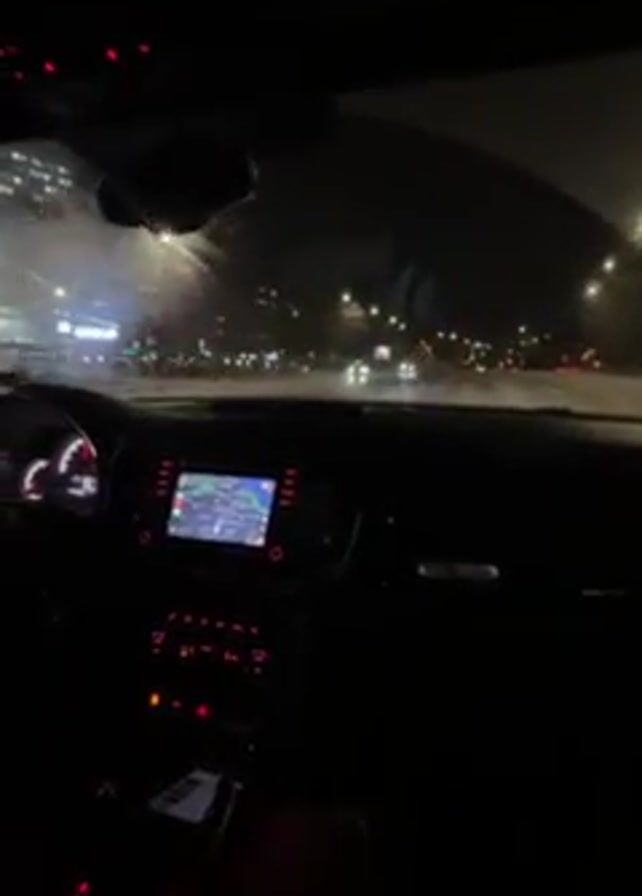 A car drives through a city at night in wet conditions. From the perspective of the driver, the dashboard glows red in the darkness of the car. The navigation screen is visible in the center console. Outside, city lights and headlights from other cars illuminate the rain-slicked road and surrounding buildings. The windshield wipers move rhythmically to clear the rain. The driver wears light-colored pants. Music is playing in the background.