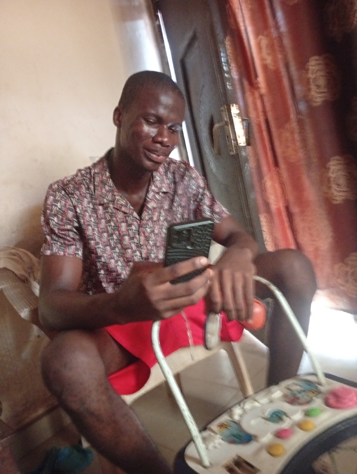 A man is seated, legs apart, in a white walker with a blue and white base. He's holding a dark phone and looking at it. He's wearing a patterned short-sleeved shirt and red shorts. A door with a tarnished gold handle is behind him, partly obscured by reddish-brown curtains. The room is otherwise dimly lit, with a beige wall visible to the left of the door.