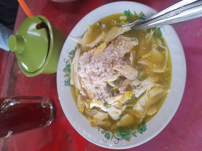 A bowl of chicken soup, possibly Soto Ayam, is the main subject