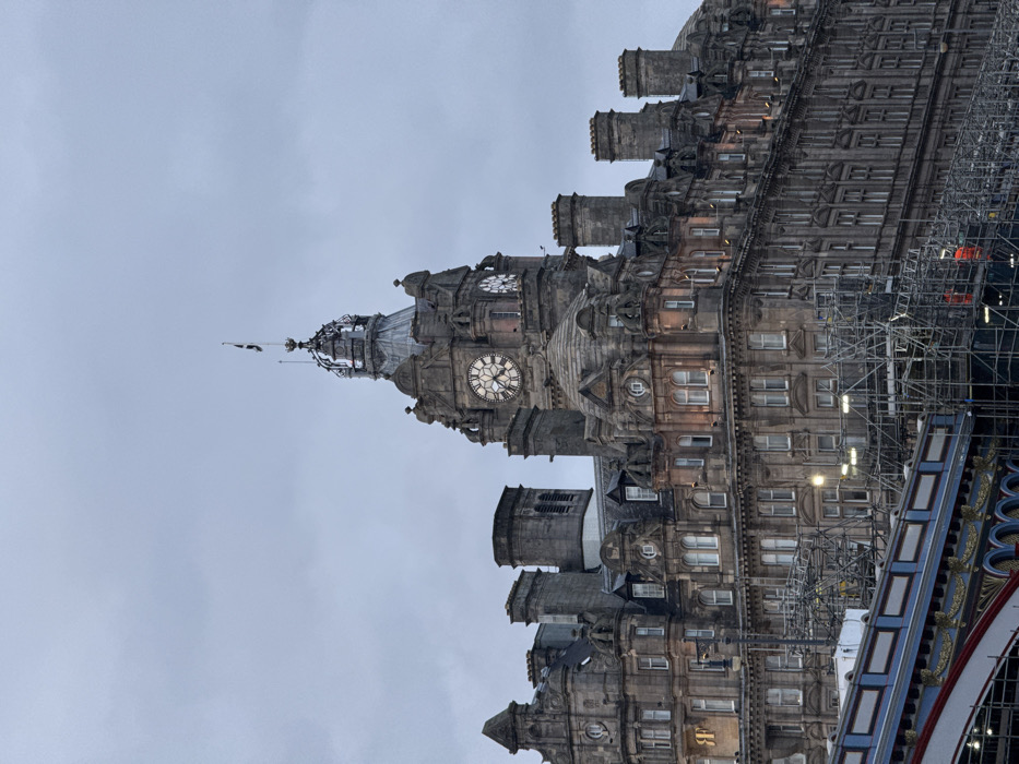A rotated view of a historic building dominates the frame. The structure features ornate architectural details, including a clock tower, multiple chimneys, and decorative stonework. Scaffolding partially obscures the building's facade. The sky is overcast and gray.