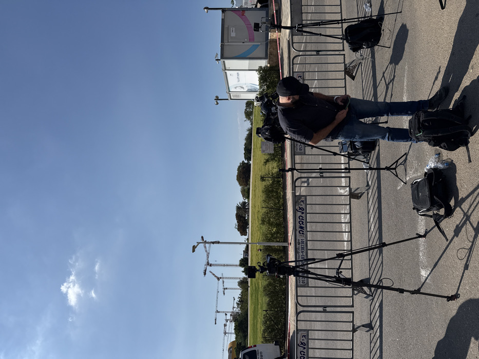 An outdoor scene in the Gei Hamlacha area of Ramat Gan, Israel, is depicted under a clear blue sky with a single scattered cloud. The foreground shows a paved asphalt surface where four professional video cameras on tripods are positioned, two with cameras mounted and two with empty tripods. Several black backpacks and plastic water bottles are present on the ground. One male individual, wearing a dark shirt, blue jeans, and a dark baseball cap, stands among the equipment, bent over and focused on an object in his hands. Immediately behind the media equipment, a line of metal crowd control barriers extends horizontally across the frame. White signs affixed to these barriers display Hebrew text, including "גי המלאכה" (Gei Hamlacha) and phone numbers (052-3830201, 052-38301). Beyond the barriers, a green, manicured grassy slope rises, topped with several trees. A white van with Hebrew text on its side is partially visible on the far left, behind the barriers. A multi-lamp street light pole is centrally located in the mid-ground. In the background, on the left, a cluster of tall tower cranes indicates ongoing construction. To the right, a white, modular portable building with blue and pink graphic elements is visible. The scene suggests a media staging area in an urban environment undergoing development.
