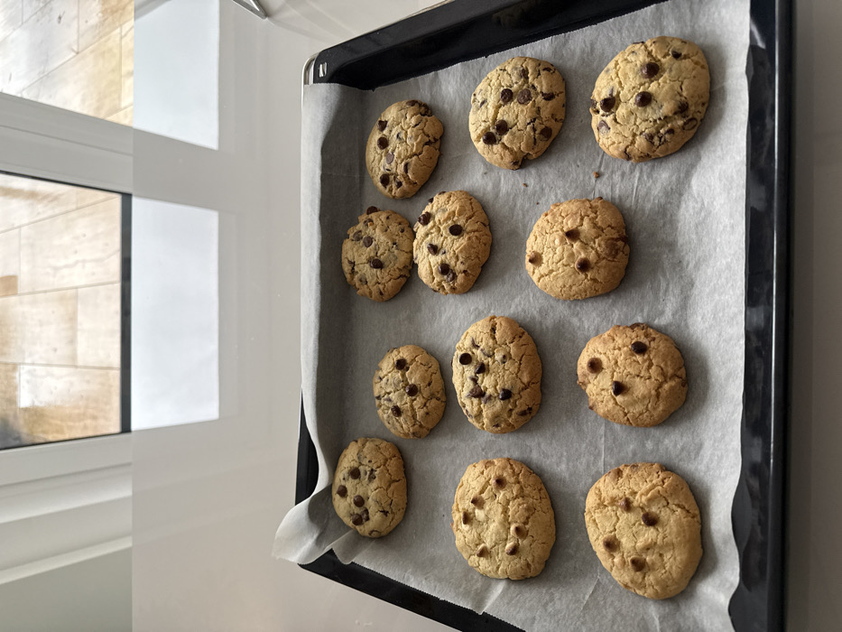 A black baking sheet lined with parchment paper holds twelve freshly baked chocolate chip cookies. The cookies are arranged in a rectangular pattern. They exhibit a light golden-brown color with scattered chocolate chips. In the background, a window reveals an exterior wall with a light-colored brick pattern. The overall scene appears to be indoors, near a window with natural light.