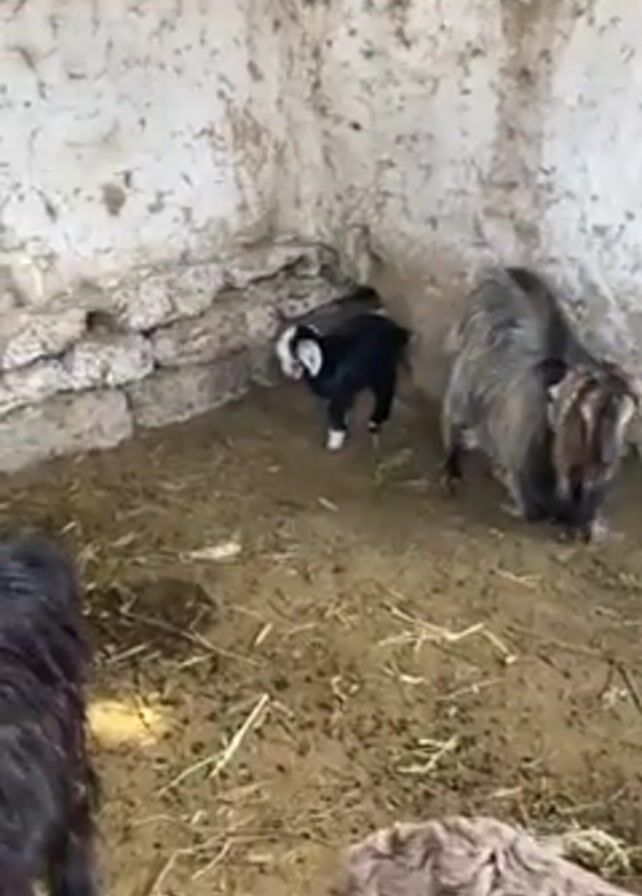 pen with goats. There is a small black goat with a white face, one goat that has gray and brown wool, and another dark-furred goat in the foreground that is partially out of frame. The pen is enclosed by rough, textured walls that look like they are made of stone. The floor is covered with hay and mud. The black goat is bleating.