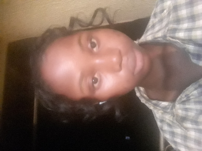 A portrait photograph captures a single individual, appearing female, with dark skin and dark, curly hair