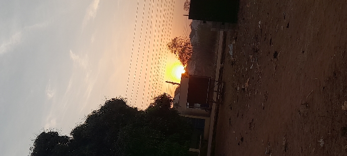 A ground-level shot captures a sunset. The sky is a blend of pale blue and orange hues. Silhouetted trees frame the bottom left and center. Electrical lines are visible in the sky. In the middle ground, a modest building and some debris sit near the ground. The foreground is a dirt patch with scattered debris. The image is rotated to the side.