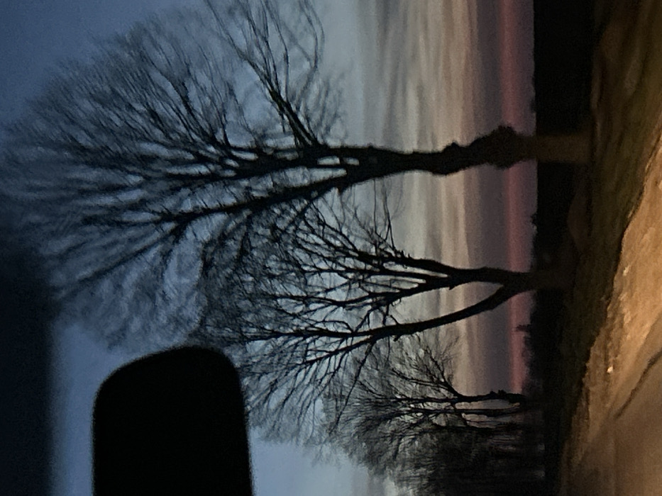 The scene captures an exterior view from a vehicle in Bezvoditsa, Bulgaria, during twilight hours. A dark, rounded rearview mirror obstructs the upper left portion of the frame. Dominating the middle ground are several silhouetted deciduous trees, bare of foliage, indicating a non-foliage season. The sky exhibits a gradient of color, from deep blue-grey overhead to a distinct band of pink and purple transitioning into red along the horizon. The distant landscape below the horizon appears as a dark, level expanse. A segment of a road, illuminated by a warm, yellow light source, occupies the lower left foreground. No individuals or specific activities are discernible.