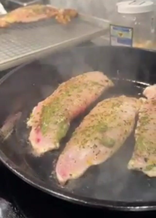 The camera focuses on a cast iron skillet placed on top of a black stovetop. Inside the skillet are three seasoned fish fillets, cooking and emitting steam. A wire rack holding another cooked fish fillet is visible in the background. A jar sits to the right of the skillet. The background features a tiled wall and a stainless-steel appliance behind the rack.