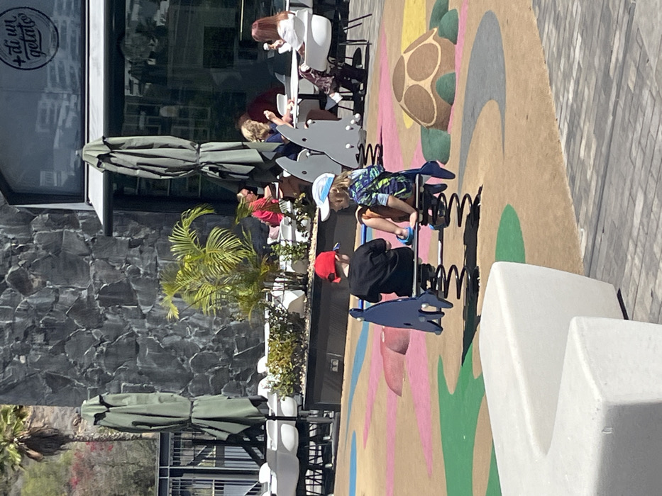 The scene depicts an outdoor public area in El Chaparral, Spain, under clear daylight conditions. In the foreground, two young children are seated on a blue spring rider shaped like a stylized marine animal, facing away from the camera. The child on the left wears a red baseball cap and a black t-shirt. The child on the right wears a light blue and white baseball cap, a patterned multi-colored shirt, and blue flip-flops. The playground surface beneath them is a multi-colored soft-fall material, displaying irregular patterns in tan, pink, green, and blue. To the immediate right of the children, a brown and green turtle-shaped play mound is integrated into the playground. A white, L-shaped concrete bench is partially visible in the bottom-left corner of the frame. Behind the playground, separated by a dark planter box containing green shrubs and a small palm tree, is the outdoor seating area of a cafe. This area features multiple round white tables and white chairs, with several large, folded green patio umbrellas providing shade. Approximately five adults are seated at these tables; one individual in a red shirt is partially visible on the left, and another person with red hair is seen holding a white container on the far right. The cafe building's facade is constructed from dark, irregularly shaped stone, and a window above the seating displays the text "+ di un gelato." A tall palm tree and distant green and reddish vegetation are visible in the upper-left background.