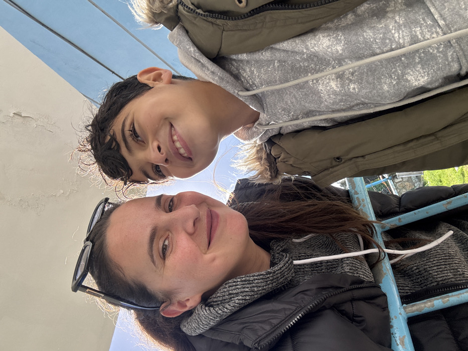 An adult female and a male child are depicted in a close-up outdoor photograph. The female, positioned on the left, has dark brown hair pulled back, with black sunglasses resting on her head. She wears a black puffer vest over a grey, textured hooded sweatshirt and smiles directly at the viewer. The child, on the right, possesses dark, curly hair and smiles broadly, looking upwards and to the right. He is dressed in a dark olive green, fur-lined hooded jacket over a light grey, speckled hooded sweatshirt. Both individuals are partially obscured from the chest down by a light blue, weathered metal railing. The background includes a white structure with peeling paint in the upper left and a blue wall in the upper right. Out-of-focus green foliage is visible in the lower background. Bright sunlight illuminates the scene from behind and above the subjects. The image does not contain specific landmarks to identify a precise location within the city of Meknes, Morocco.