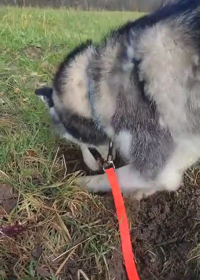 A medium shot shows a husky dog digging in dirt and grass in a field