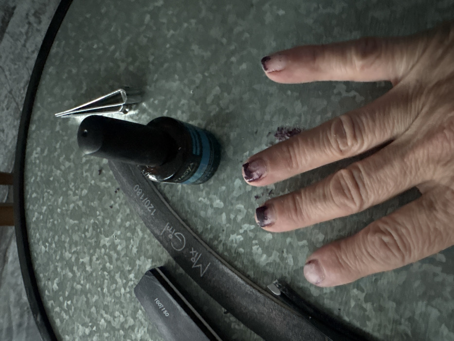 - "A hand rests on a gray, textured surface, the nails partially covered with dark purple nail polish" by FM-jgPhH3, licensed under CC BY 4.0