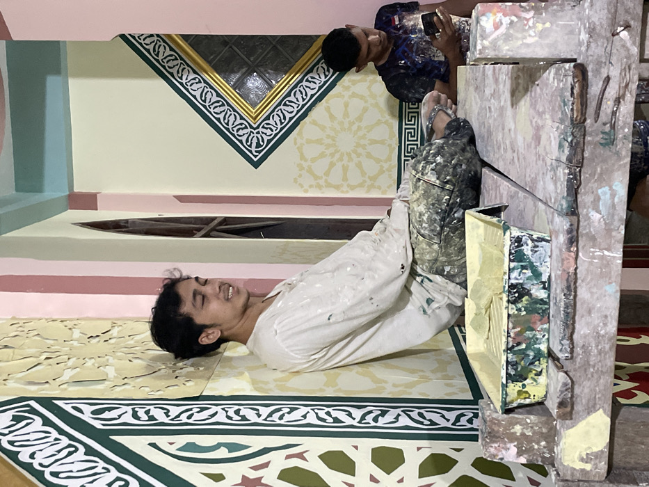 Two men are working on painting a room with intricate geometric designs. One man lies on his back on a patterned floor, his face visible, dressed in paint-splattered overalls. Another man, wearing a paint-covered shirt and sandals, stands atop a scaffold-like structure made of paint-stained boards and containers. He looks at a cell phone. The walls behind them are adorned with similar geometric patterns, and a window is framed by a golden border.