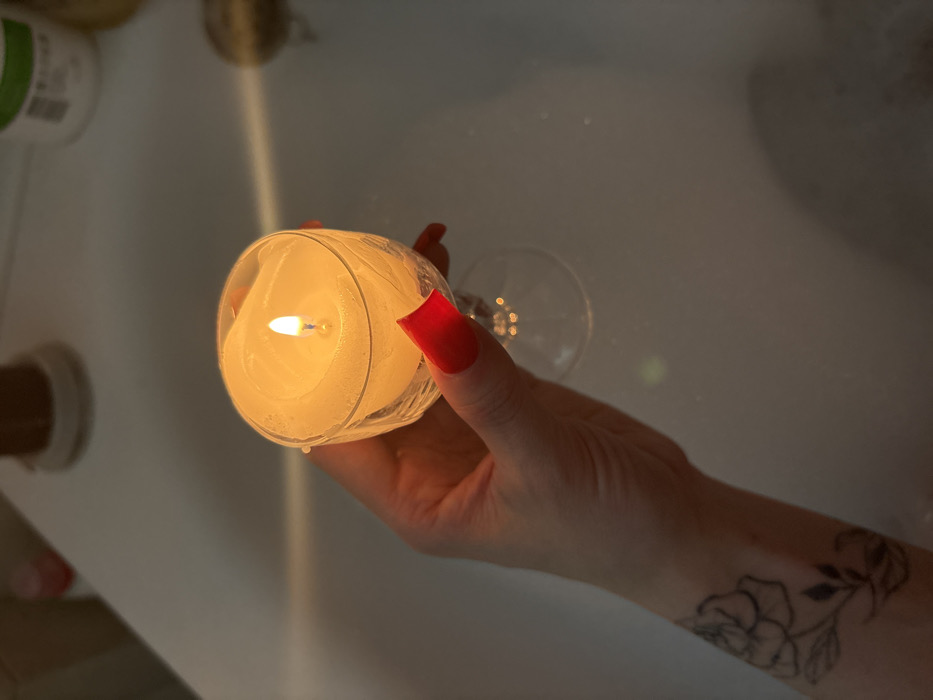 An indoor scene in a dimly lit environment, likely a bathroom, features a human left hand holding a lit candle contained within a clear glass goblet