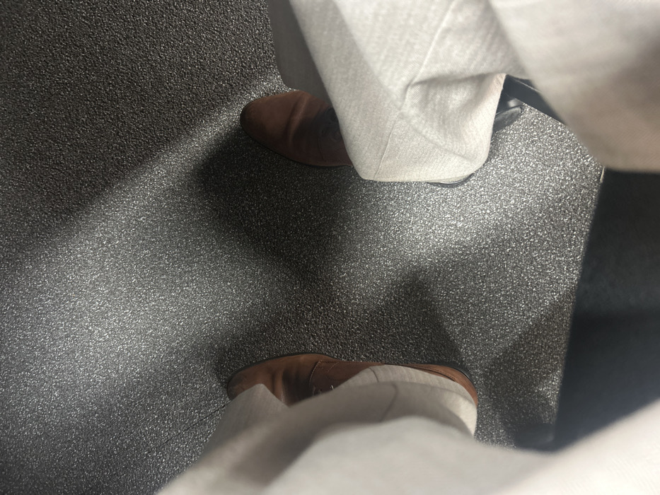 The image displays a first-person, downward perspective of an individual's lower body, situated in Chatou, France. The subject is wearing light-colored, possibly grey or beige, trousers and brown leather shoes. The shoes appear to be a smart casual or dress style. Both feet are resting on a dark grey, textured floor surface, which has a speckled pattern, consistent with industrial carpeting or anti-slip flooring. Shadows are cast on the floor, indicating a direct or angled light source from above. No other individuals or identifying environmental features are visible.
