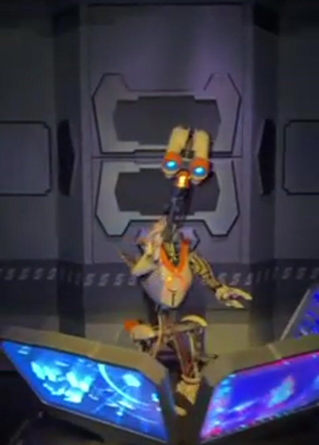 A robotic figure stands behind a console with multiple lit screens displaying blue and purple graphics. The robot is mostly white with orange and silver accents and has a long, thin neck topped with two blue lights resembling eyes. It is in a room with gray paneled walls. The robot moves its arms slightly while standing in front of the console.