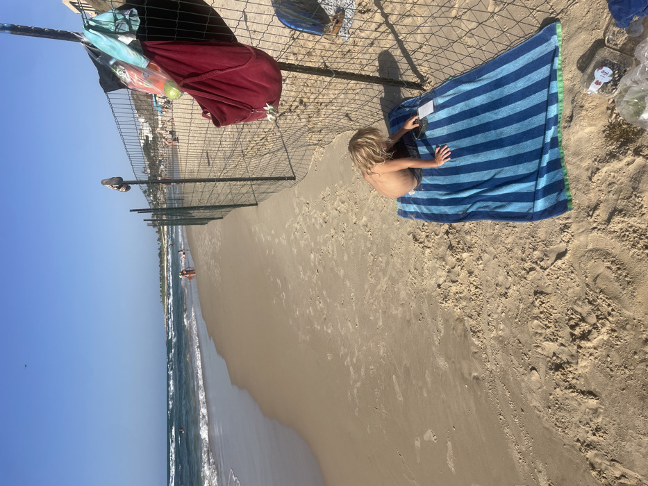 The image depicts a sunny beach scene in Northern Tel Aviv, Israel. In the foreground, a young child with long blonde hair, partially unclothed, sits upright on a blue and white striped beach towel laid on the tan sand. The child is observed looking down at a dark object held in one hand and a white rectangular item on the towel. Adjacent to the child's towel, near a fence post, a clear plastic container with dark, possibly edible contents, and a translucent plastic bag holding green items are visible on the sand. A green metal mesh fence extends diagonally from the mid-right foreground towards the background, paralleling the shoreline. Attached to this fence are various objects: a pair of brown flip-flops are balanced atop a fence post, a dark red fabric bag hangs from the mesh, and other items including a light blue towel or garment and a clear plastic bag containing a green object are also suspended. The mid-ground features a broad stretch of sandy beach sloping towards the Mediterranean Sea on the left. Moderate waves are breaking near the shore. In the distance along the beach, multiple individuals are visible; some are wading or swimming in the water, while others are seated or walking on the sand. Further along the coastline, distinct rocky formations are present in the sea. The background reveals a clear blue sky without clouds, and distant urban development consisting of buildings is discernible along the horizon. A small, dark, winged object, possibly a bird or aircraft, is visible high in the sky.