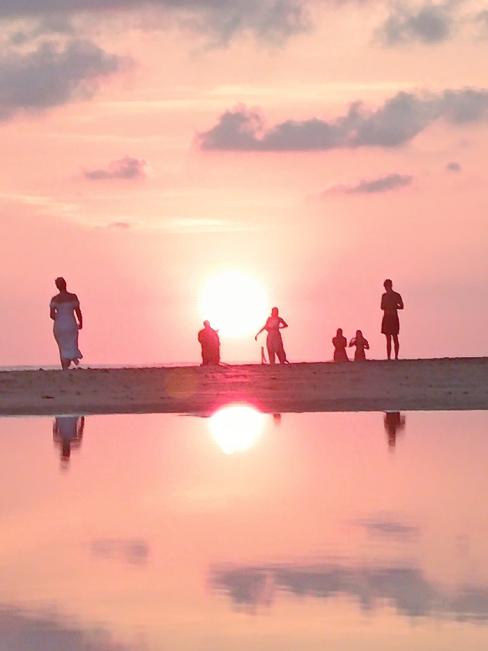 This image depicts a sunset scene in Kathaluwa, Sri Lanka. The environment is dominated by a clear horizon line separating a strip of sandy land from a reflective body of calm water in the foreground. Above the land, a vibrant, circular sun is positioned low on the horizon, illuminating the sky with intense orange and pink hues, interspersed with scattered, darker clouds. Six human figures are silhouetted against the bright sky and sun, standing on the sandy strip of land. Their reflections are distinctly visible in the calm water below, mirrored with precision. From left to right: 1. A figure, dressed in what appears to be a light-colored, flowing garment, is walking towards the right side of the frame. 2. A second figure is in a kneeling or seated posture. 3. A third figure stands directly in front of the sun, holding a vertical object that resembles a cricket bat. 4. Two smaller figures, possibly children, are positioned closely together, appearing to stand or kneel to the right of the sun. 5. A sixth figure, dressed in shorts and a t-shirt, stands facing towards the left side of the frame. All figures are dark silhouettes, providing minimal detail of their individual features or specific attire beyond their general form and posture. The scene is monochromatic in nature, with the dominant colors being shades of orange, pink, and red from the sunset, contrasting with the dark silhouettes of the figures and clouds.