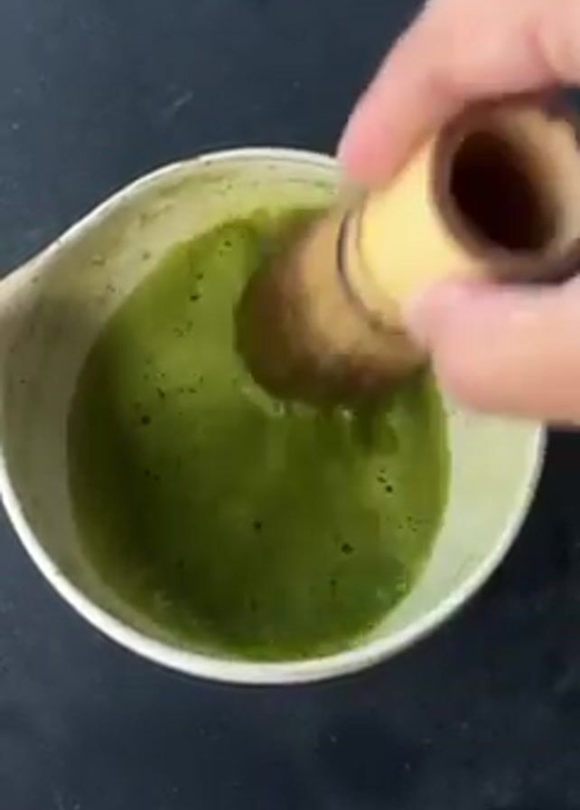 A close-up shot shows a hand holding a bamboo whisk in a light-colored bowl containing a green liquid, likely matcha