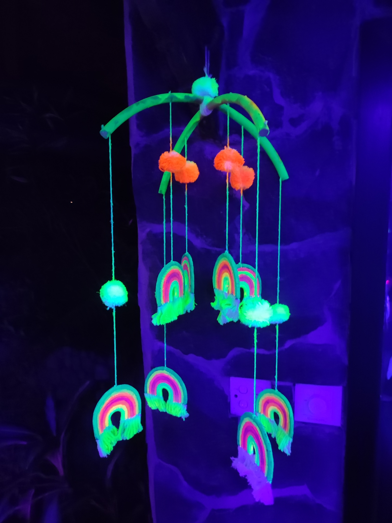 A handmade decorative mobile is suspended against a dark, textured wall under ultraviolet (blacklight) illumination in Lokaserena, Indonesia. The mobile features a bright fluorescent green arc-shaped frame from which multiple strings descend. Attached to these strings are three luminous orange spherical pom-poms, two glowing cyan-green spherical pom-poms, and approximately eight semi-circular ornaments resembling rainbows. These rainbow ornaments display concentric bands of fluorescent pink, yellow, and green, with a green fringed base. The wall exhibits a deep violet hue due to the blacklight, with two discernible white electrical outlets or switches positioned on the right side. Faint outlines of dark foliage are visible in the extreme left background.