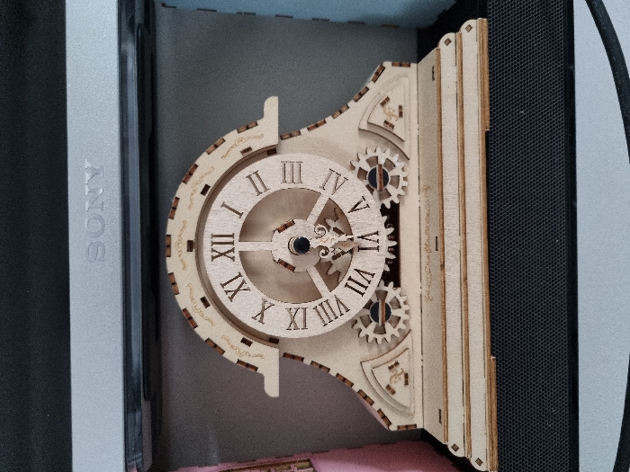 An indoor scene in Esch-sur-Alzette, Luxembourg, depicts a light-toned, laser-cut wooden mantel clock positioned centrally. The clock features an arched top, a circular face displaying dark Roman numerals (I-XII, utilizing 'IIII' for four), and two ornate dark hands indicating approximately 10:05. Decorative scrollwork is engraved into the clock's wooden structure, and two decorative wooden gears are visible below the main dial. The clock rests upon a black mesh surface, which itself sits on a lighter-colored surface. Directly above the clock, a silver electronic device prominently displaying the 'SONY' logo is visible. The immediate background is a light grey surface, with partial views of a pink object on the left and a light blue object on the right periphery of the frame. A black cable is partially visible in the bottom right foreground.