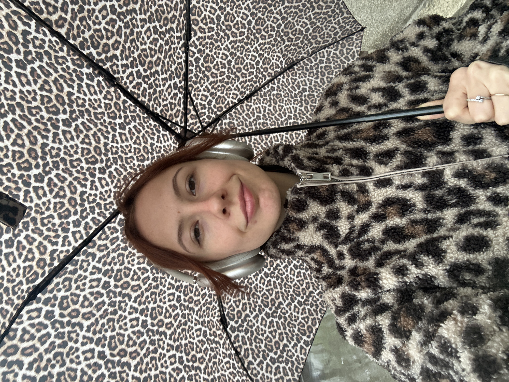 A close-up, chest-up portrait depicts a young adult female outdoors in Novi Sad, Serbia. She has reddish-brown hair and is wearing silver over-ear headphones. Her torso is covered by a zipped-up, textured jacket featuring a brown, black, and cream leopard print. She holds an open umbrella with an identical leopard print pattern with her right hand. A silver ring with multiple clear stones is visible on her right ring finger, alongside a plain band on her middle finger. Her gaze is directed at the camera, and her expression is a slight smile. The background is blurred, indicating an outdoor environment.
