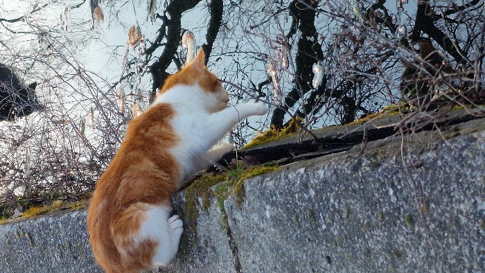 An orange and white domestic cat is positioned on a weathered, light grey concrete barrier in Topolovets, Bulgaria. The cat, exhibiting primarily ginger fur on its back and tail and white fur on its underside, legs, and face, is leaning forward and downwards over the edge of the barrier. Its head is angled towards the water below, and its front right paw is extended towards the water's surface. The concrete barrier shows visible aggregate, cracks, and a significant growth of dark green moss along its vertical edge and in a visible fissure. Adjacent to the concrete, a body of water reflects bare tree branches and a light sky, creating a mottled pattern of dark and light. Several small, irregular, lighter-colored objects, possibly leaves or ice fragments, are visible floating on the water's calm surface. Bare, thin branches protrude into the frame from the water side.