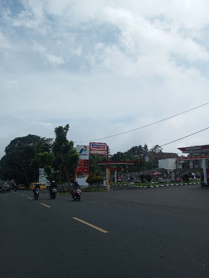 The image displays a roadside scene under a partly cloudy sky, located in the city of Sandamal Eliya, Sri Lanka. A dark asphalt road occupies the foreground and midground, marked by a single dashed yellow line on the right side. Three individuals, each operating a motorcycle and wearing a helmet, are traveling away from the viewer on the left lanes of the road. To the right of the road, a commercial establishment is visible, featuring a gas station and a convenience store. A prominent tall sign displays the "Pertamina" logo and fuel prices, with the "Alfamart" logo situated above it. The gas station area, accessible via a curb and a white and black patterned barrier, includes multiple fuel pumps under a red canopy bearing "Pertamina" branding. Behind this complex, a white building with a reddish roof is partially visible, situated amongst dense green foliage. The left side of the road is lined with numerous large, green trees. The sky is largely covered with white and light grey clouds. A thin, dark utility line spans diagonally across the upper right quadrant of the image.