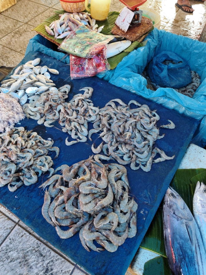 The image displays a market stall in Tuha Gp Gajah, Indonesia, featuring an assortment of seafood