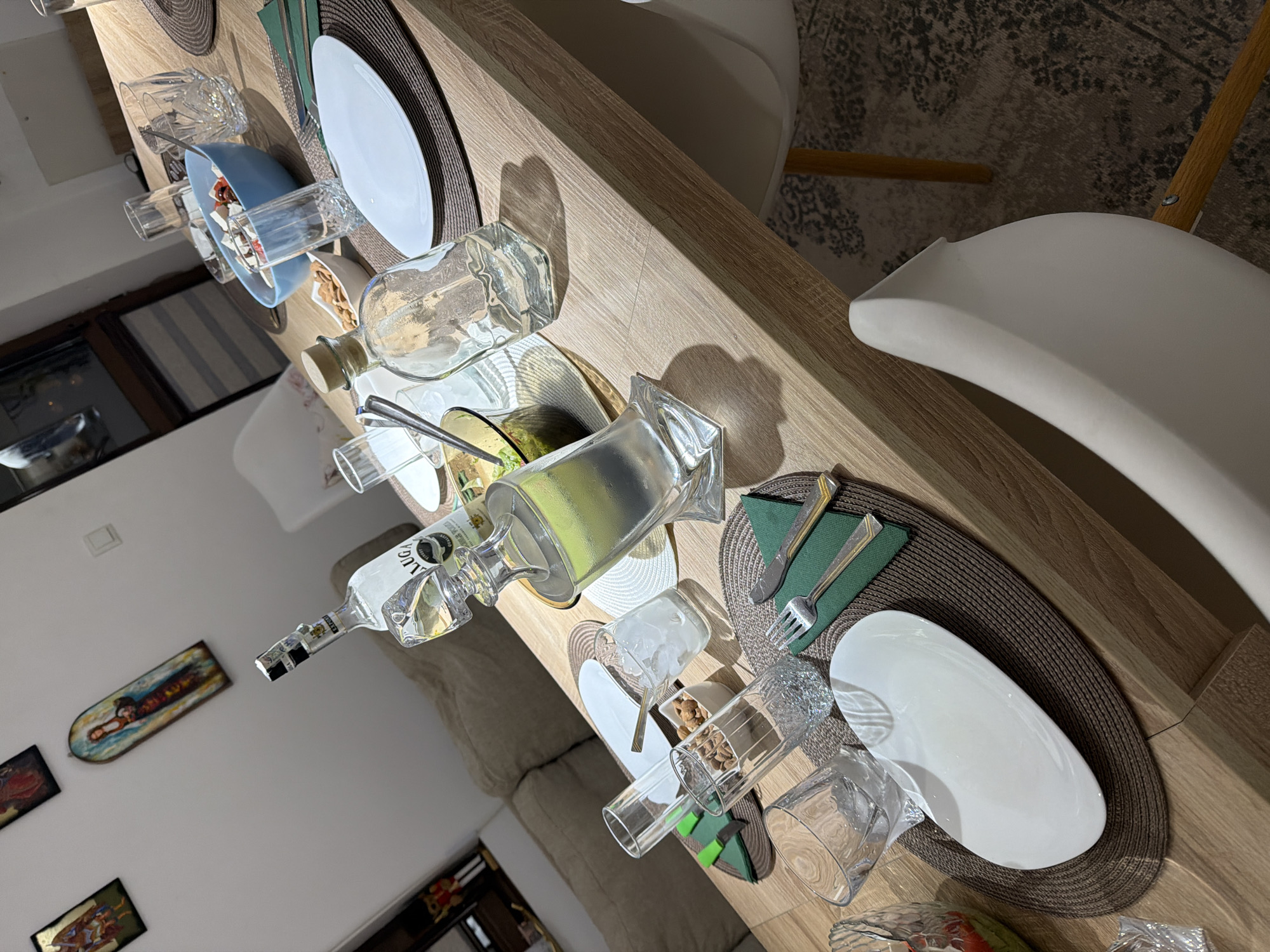 The image depicts a dining table set for a meal, located in what appears to be a private residence. The table is made of light-colored wood and has two place settings. Each setting includes a round woven placemat, a white plate, a green napkin, a fork, and a knife. Numerous glasses and bottles are scattered across the table. One of the bottles is a Beluga vodka bottle. Some of the glasses contain what appear to be nuts. The scene is indoors. There's no indication that the location is in Razgrad, Bulgaria, or any specific city, so I cannot confirm that. There are no people visible in the image.