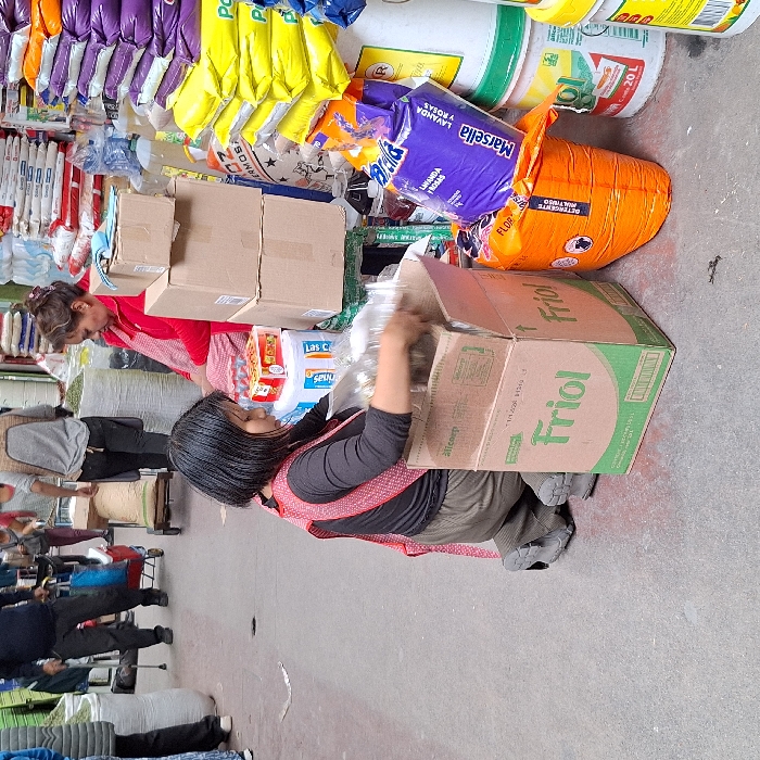 Two women, one in red and one in black with a red apron, are working amidst a cluttered scene. Various packaged goods surround them, including laundry detergent like "Marsella" and "Friol" cooking oil in a cardboard box. White buckets labeled "20 L" are visible, and bags of unknown items with "Po" and "P" labels are also present. The area is filled with boxes, bags, and containers of assorted products, suggesting a warehouse or market setting.
