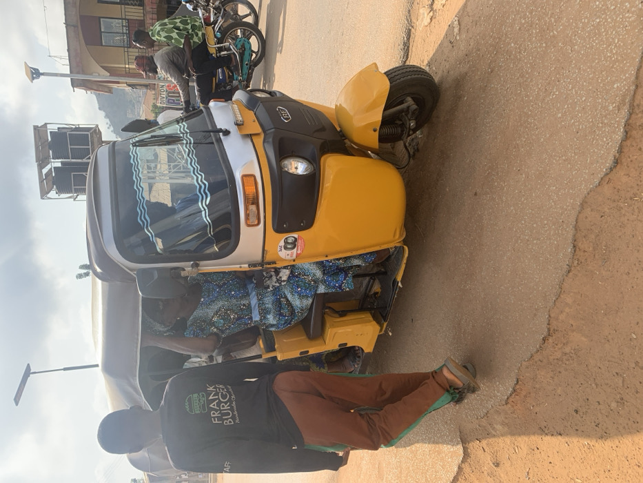 The scene depicts a street in Egbedi, Nigeria, under daylight conditions. In the foreground, a man walks away from the camera, wearing a black long-sleeved shirt with "FRANK BURGER Handmade Goodness" on the back, brown pants with green side stripes, and sandals. Adjacent to him on the right is a yellow and brown Bajaj RE three-wheeled auto-rickshaw (tuk-tuk). A woman wearing a blue patterned dress is seated inside the tuk-tuk on the left passenger side. The driver is partially visible behind the windshield. Further into the background, two men are positioned on a motorcycle; the rider wears a grey shirt and red cap, and the passenger wears a green patterned shirt. Architectural structures, including a building with a "DIYTON POS" sign and a stand supporting two black water tanks, are visible. Two solar-powered streetlights are present. The ground consists of a paved road transitioning to a dirt shoulder on the left, with hilly terrain in the distant background.